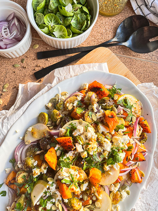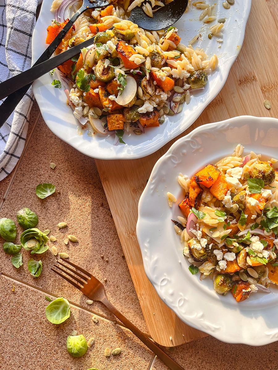 - In a large bowl or on a larger tray, add orzo and top with roasted pumpkin and Brussels sprouts, onion and apple cut into half moons, coriander, pumpkin seeds and crumbled feta cheese. Pour the dressing over the salad and mix well.