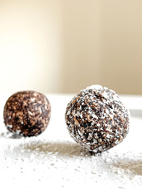 - U blenderu samljeti bademe do teksture brašna. Dodati datulje, zajedno s vodom, zobeno brašno, kokosove mrvice i kakao, pa nastaviti blendati dok se sastojci ne povežu do jednolične smjese. Ako je smjesa gnjecava, dodati još malo zobenog brašna.